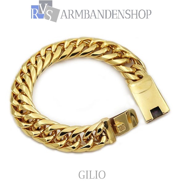 Rvs Gold plated armband. De armband is 22 cm lang en 16 mm breed en 7mm dik.
