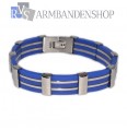 Deze armband is 21 cm lang en 1.3 cm breed.De band is glimmend rvs met blauwe inlay.
